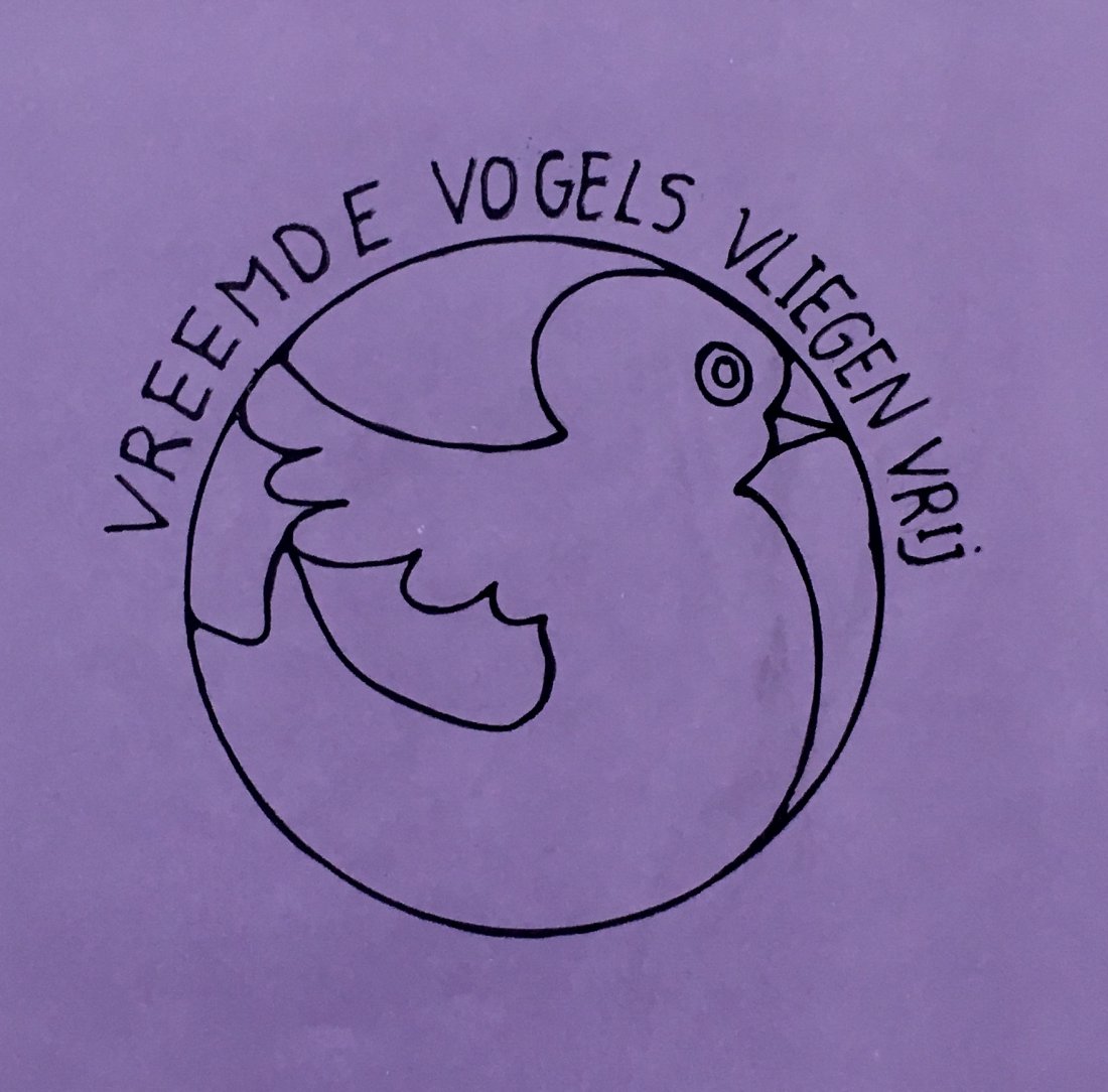 techniek : zwart papier vogelhuis +wit krijt en zwart karton nestje +omtrekvormen + kleurkrijt.