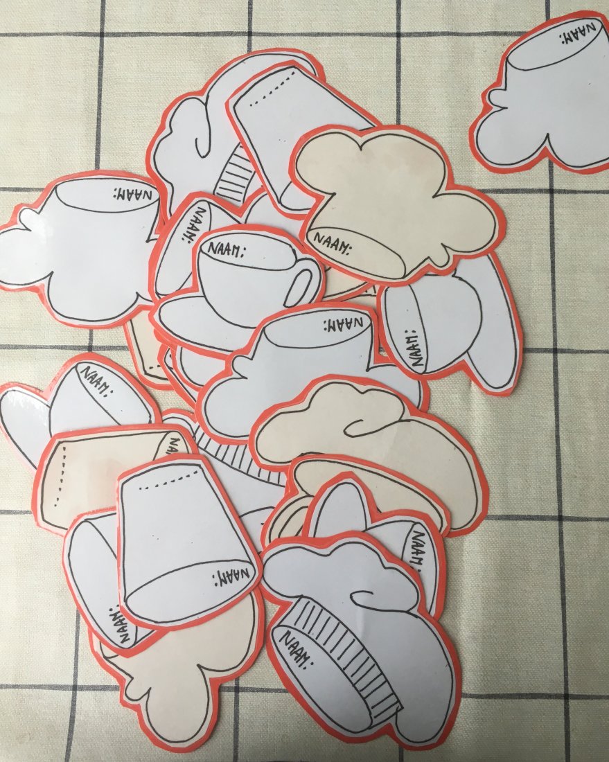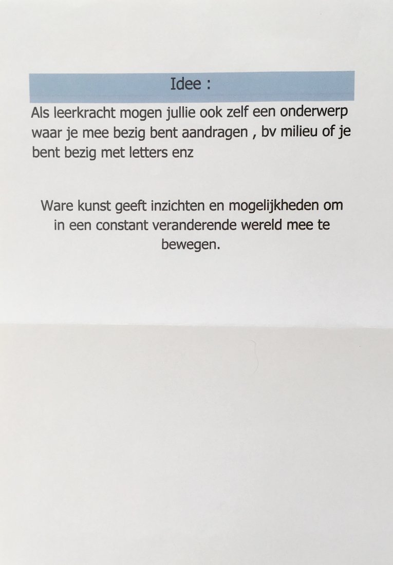 gedachte / werkwijze : inspirend materiaal , wat krijgen we mee, wat zouden we kunnen zijn ..., voorbeelden maken en aan de slag met het neergelegde matriaal , persoonlijke begeleiding