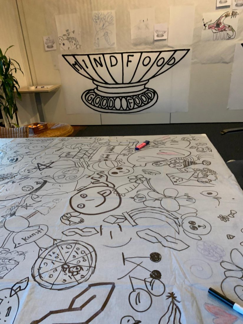 techniek : in overleg verf op zwartdoek of stift/krijt op karton / groot papier