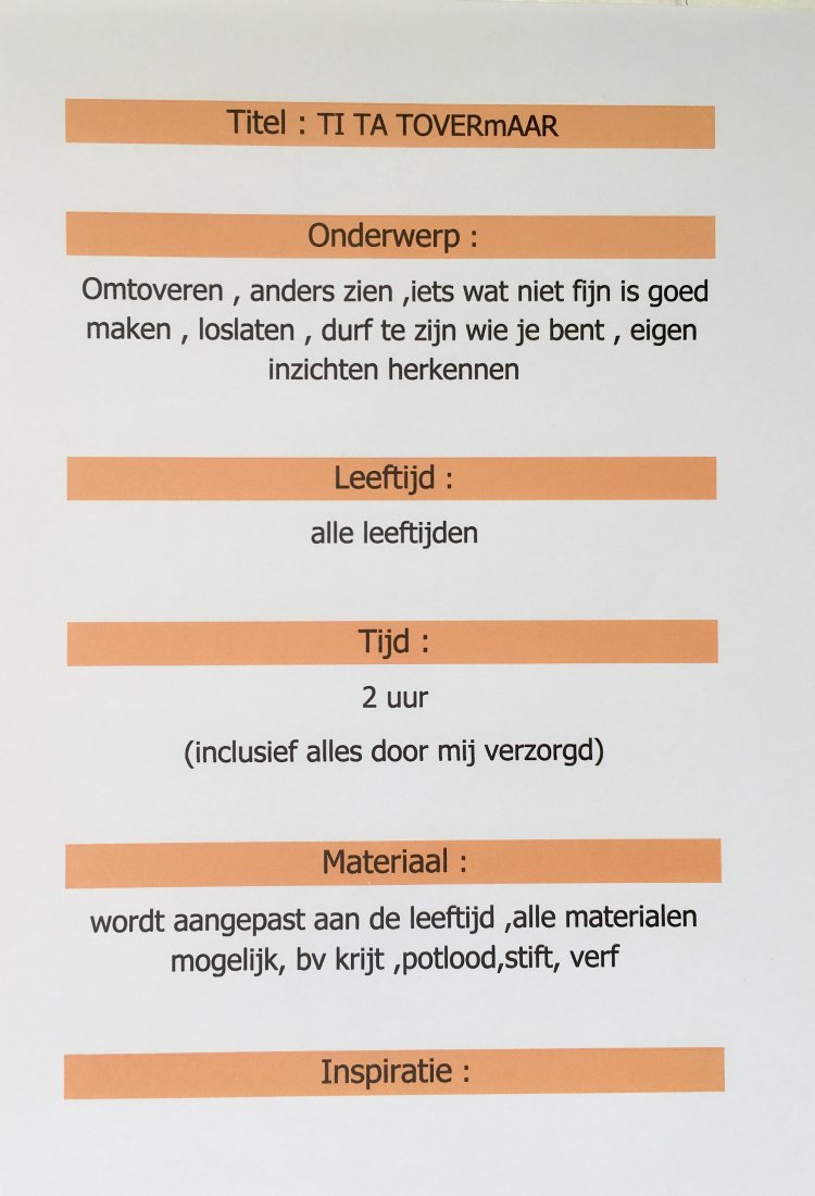 werkwijze ; we beginnen in een kring op de grond bij ons inspiratie materiaal , oa maskers , spiegletjes en maken voorbeelden , ,dan zelf maken , alles ligt klaar voor ieder op de tafels.., ik begeleid persoonlijk, je kunt zoveel ,
